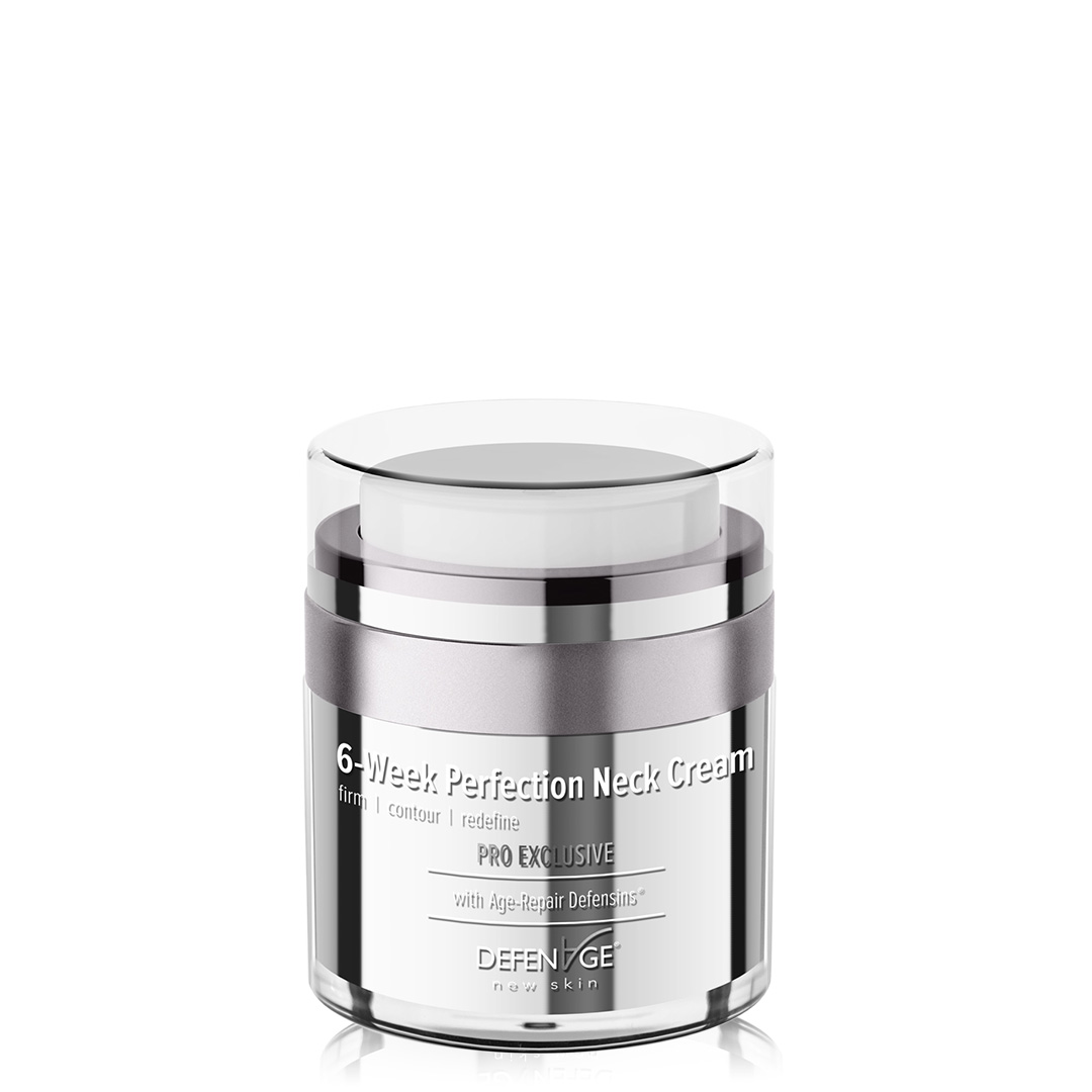 The DefenAge 6-Week Perfection Neck Tightening Cream is a luxe anti-aging neck-firming cream formulated using leading scientific advances. It has become the best neck-firming cream in the industry for its ability to correct the challenging deep lines, folds, and impacts of gravity on the fragile skin of the neck, where aging is often more noticeable.
